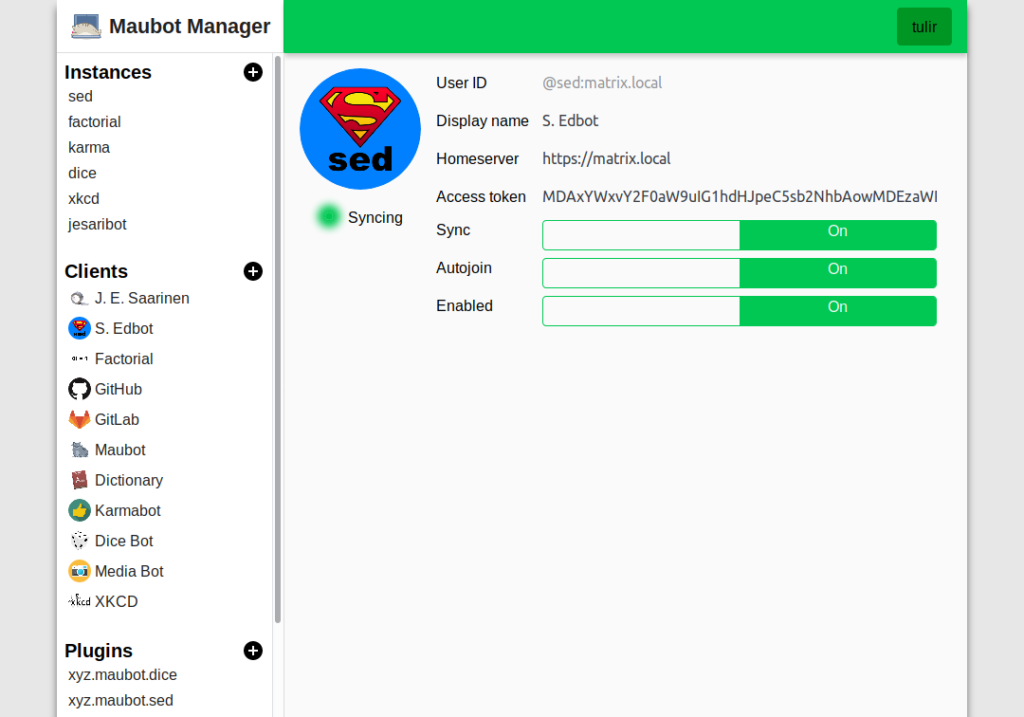 The maubot management UI has progressed well, but isn't quite ready yet. I think it should be usable by Next Week in Matrix. It can be used to set up and configure a maubot instance and plugins. Once it's ready, it should be possible to do everything except installing maubot itself through the UI: installing and updating plugins, adding matrix clients, configuring plugin instances, viewing logs, etc.