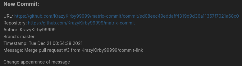 formatandmsgtypebased on arbitrary values from the webhook JSON via Jinja2. Shoutout to qg for suggesting this and giving their feedback!- compatibility with matrix-appservice-webhooks forks that read