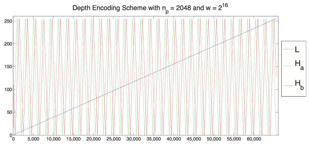A quick search showed that some folks had already proposed a method for encoding depth data into a video signal, back in the days of the Kinect: https://reality.cs.ucl.ac.uk/projects/depth-streaming/depth-streaming.pdf. The paper outlines a fairly simple approach: you encode the 16-bit depth data into the three 8-bit colour channels; putting the coarse depth data into Blue, and then finer-grained depth data into Red and Green, encoding it as a periodic triangle wave: